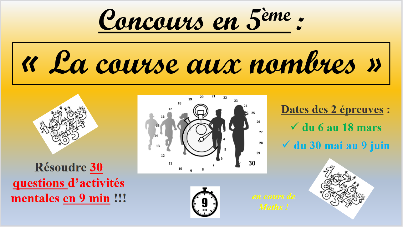 Il s’agit d’un concours d’activité mentales d’une durée courte ( 9 minutes) portant sur des thèmes mathématiques variés. L’objectif est de mobiliser les élèves et de développer leurs compétences en mathématiques.